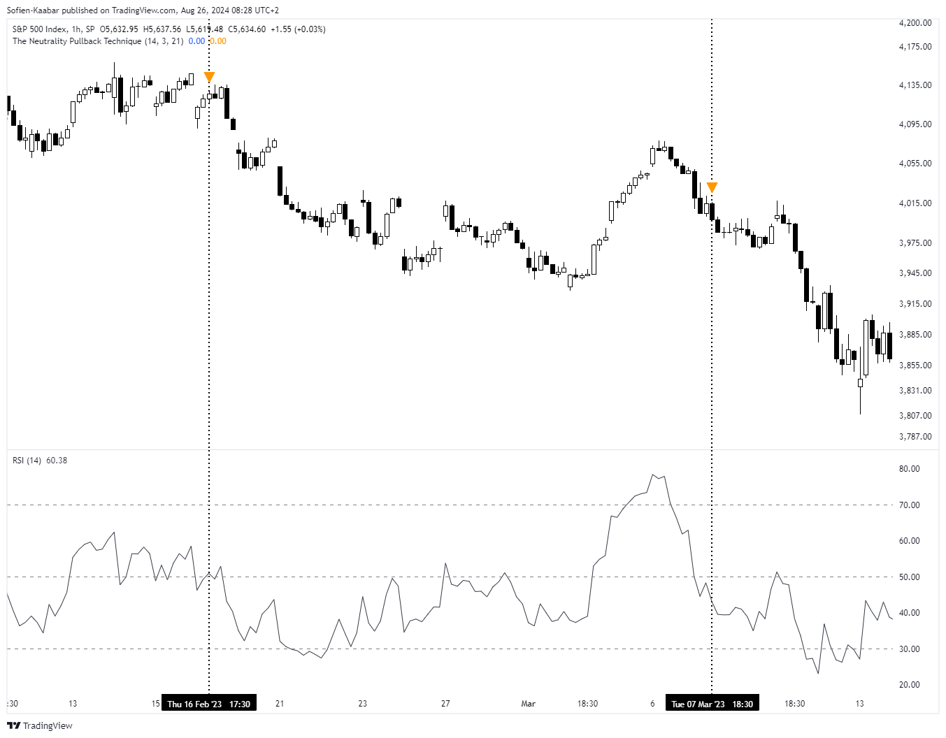 The next chart shows the RSI in TradingView with 30 and 70 as oversold and overbought levels respectively. Additionally, we can plot 50 as the middle line (or what is known as a neutrality level that splits bullish and bearish momentum).