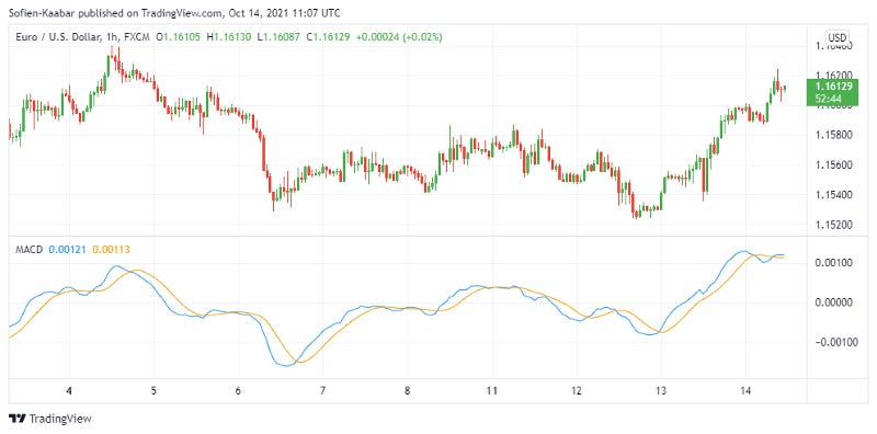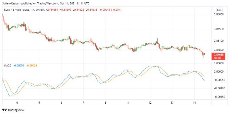 The above chart shows the hourly values of the EURGBP plotted alongside the MACD oscillator where the blue line is the MACD line and the orange line is the MACD signal. Now, our aim is to go to TradingView and code this oscillator ourselves. Why should we do this knowing that it already exists in their proposed indicators?