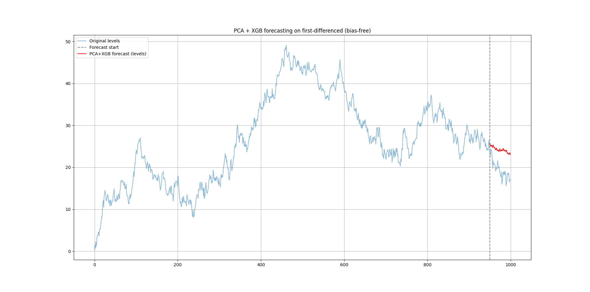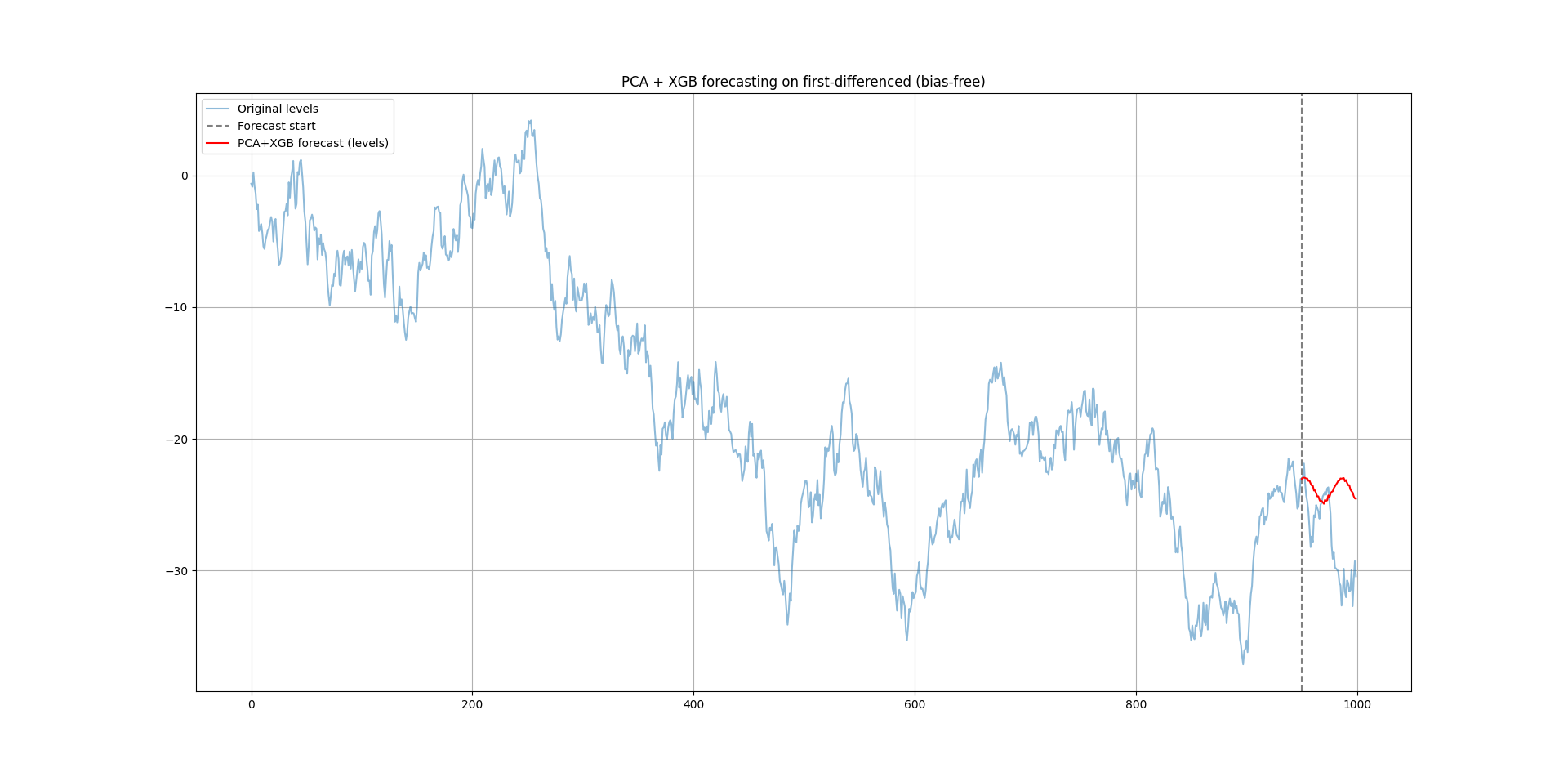 plt.title("PCA + XGB forecasting on first-differenced (bias-free)")