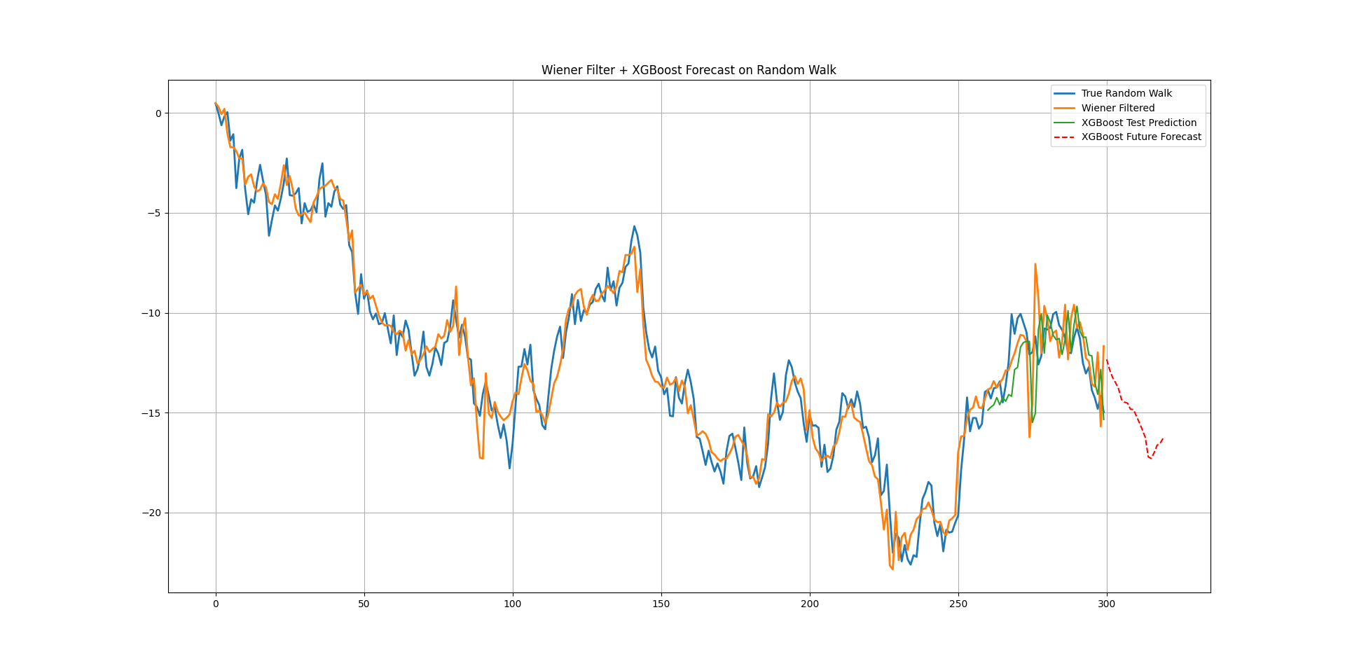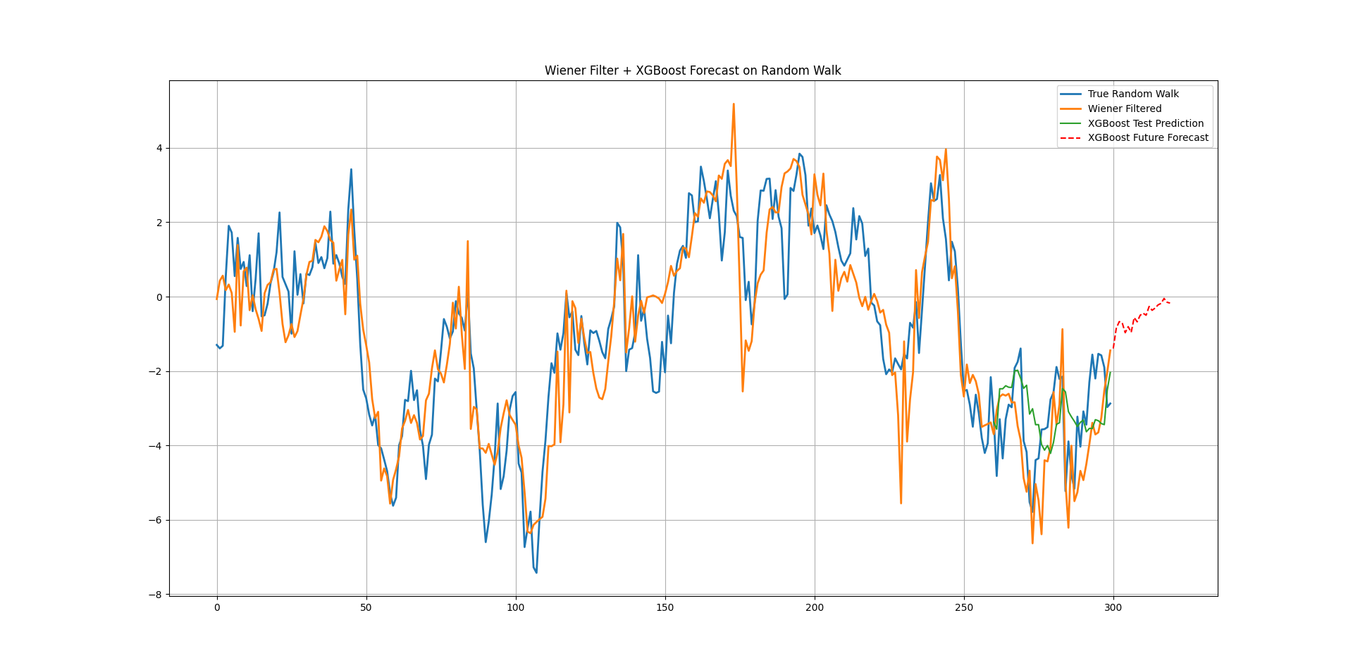 We will generate a random walk then apply the Wiener filter to smooth it out. Finally, we will run an XGBoost regression on the latter and use a multi-period forecasting technique to project a future trajectory (instead of a t+1 forecats). For this, we will sumply use the prediction as a feature so that we continue doing it into the future.