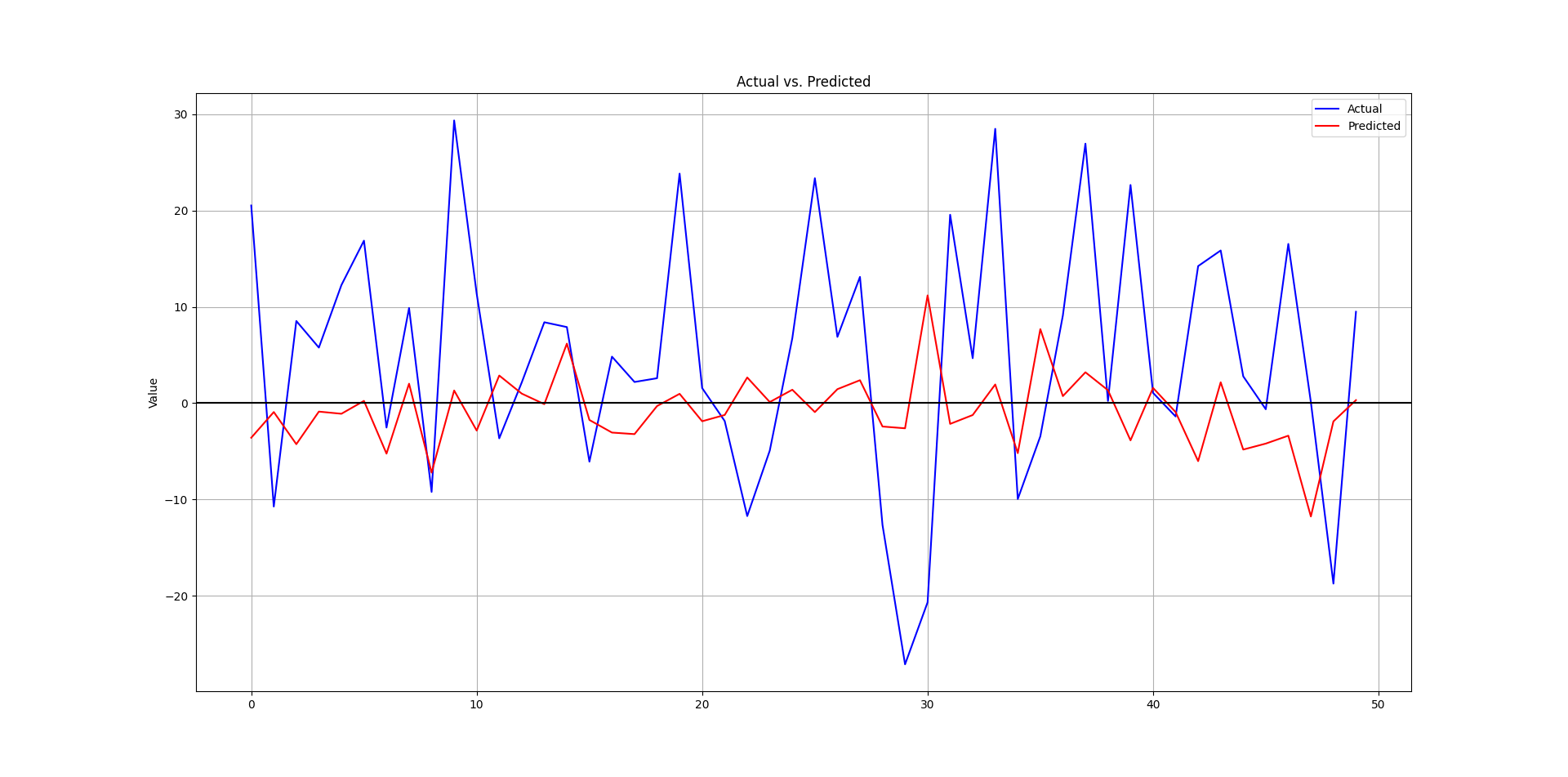 plt.axhline(y = 0, color = 'black')The following is the plot that compares the real data from the test set and the predicted data.