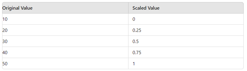 Notice how 50 (the biggest number) has a normalized value of 1 and 10 (the smallest number) has a normalized value of 0.