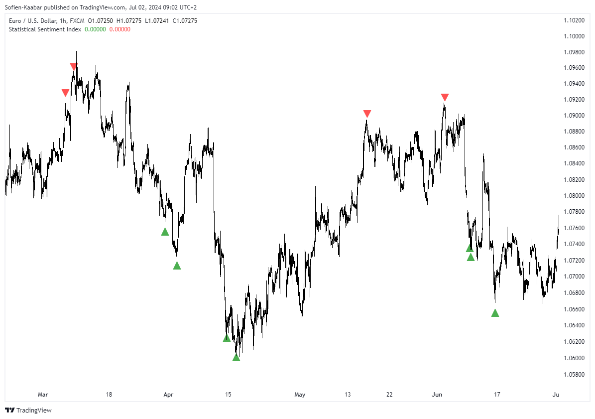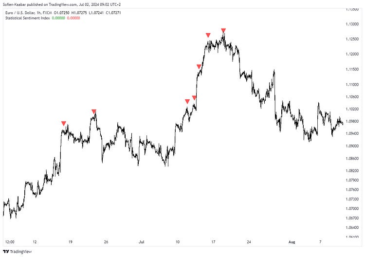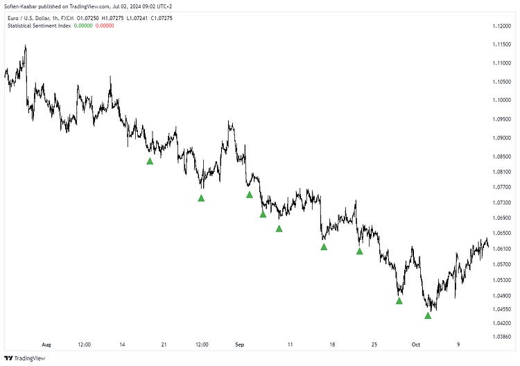 The way the SSI works is by trying to capture the corrections of extended trends. This is why it’s common to see its signals around the end of a long trend.