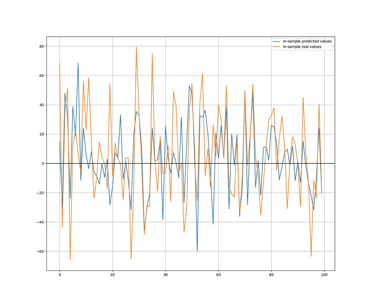 The following graph shows the in-sample predictions versus the real values. They share a strong positive correlation. The hit ratio is 63.11%.