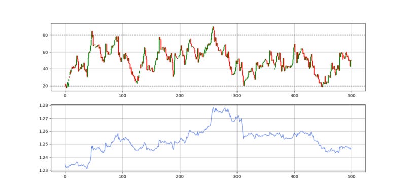 The below chart shows the candlestick RSI in the first panel with the EURUSD hourly values in the second panel.