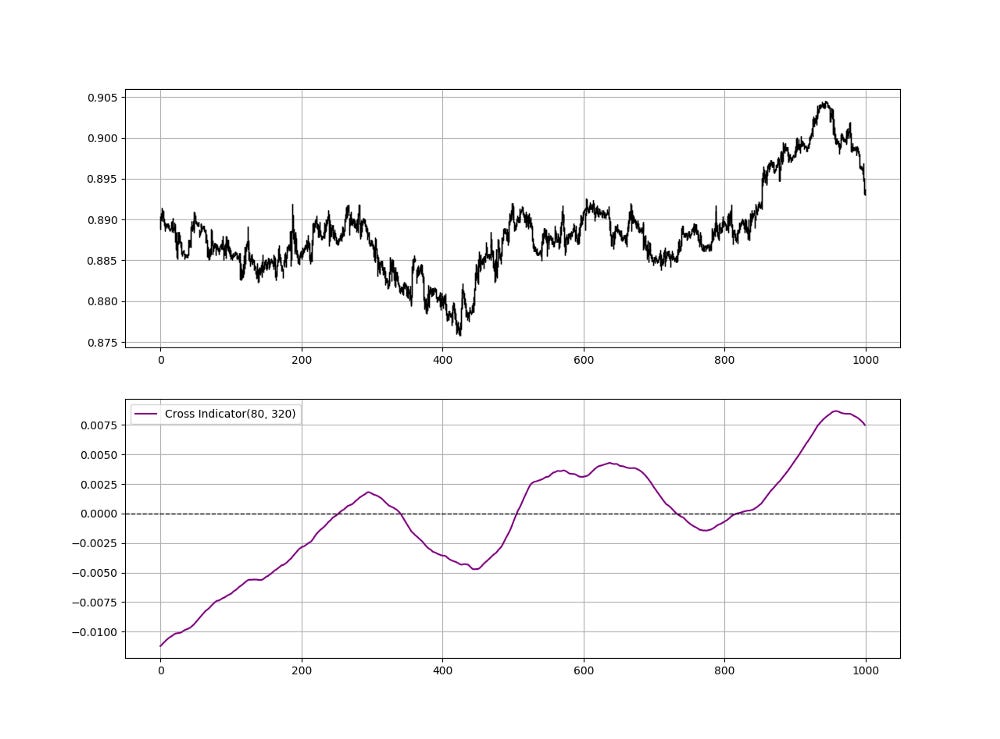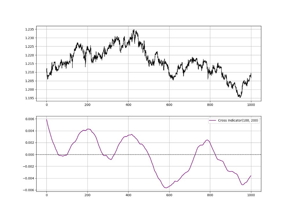 The Cross Indicator is a type of signal of when the two moving averages cross. It is composed of the difference between the short-term moving average and the long-term moving average.