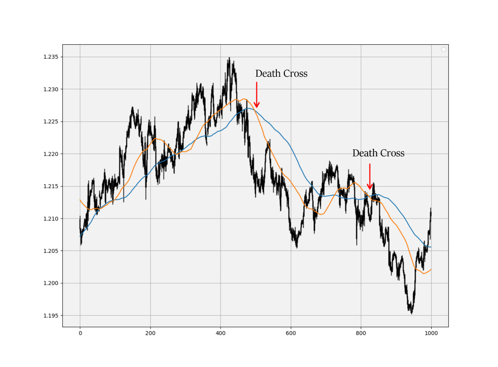 A Death Cross occurs when the short-term moving average crosses the long-term moving average from the above to the below signaling a confirmation of the bearish trend and an acceleration to the downside.
