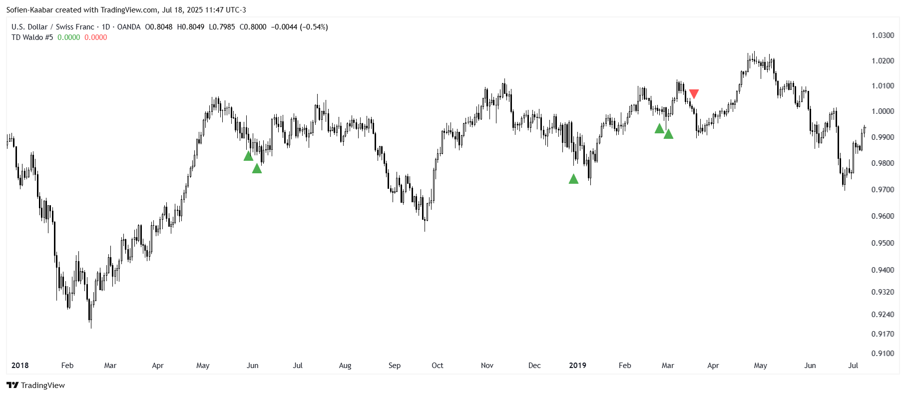A bullish signal is generated whenever the last three lows are below the 5-period moving average of each respective period while the close prices above the moving average. Additionally, the close price must be above the close price from 13 periods ago.