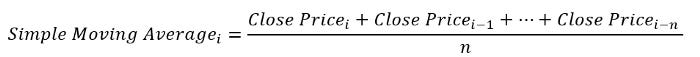Moving averages come in all shapes and types. The most basic type is the simple moving average which is simply the sum divided by the quantity. The next mathematical representation shows how to calculate a simple mean given a dataset: