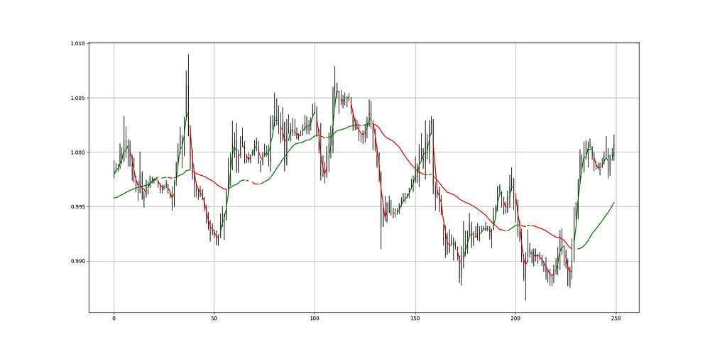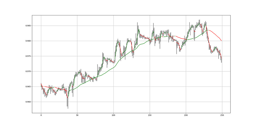 The next Figure shows an example on the EURUSD. It is worth noting that the moving average is shown in green when the rate of change is positive and it is shown in red when the rate of change is negative.