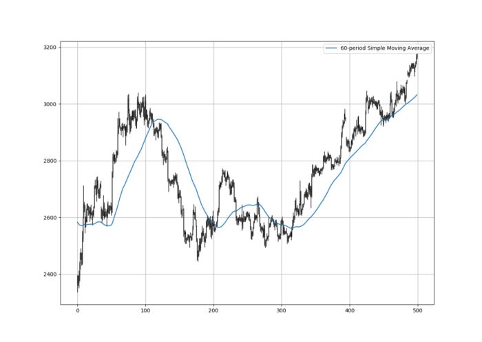 Therefore, the simple moving average is the sum of the values divided by their number. In technical analysis, you generally use moving averages to understand the underlying trend and to find trading signals. Check the next Figure which shows a 60-period simple moving average applied on hourly values of Ethereum versus USD.